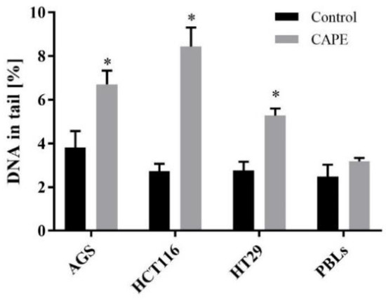 The percentage DNA content in comet tails in all the experimental series did not exceed 10%. The most sensitive cells to CAPE were the HCT116 line, where DNA damage was up to 8.44% (Figure 6). Less DNA damage occurred in AGS and HT29 cells, for which the values were 6.71 and 5.58%, respectively. The lowest percentage of DNA damage occurred in PBL, at 3.13% (Figure 6). Data for all the neoplastic cells were significantly different from the negative control.