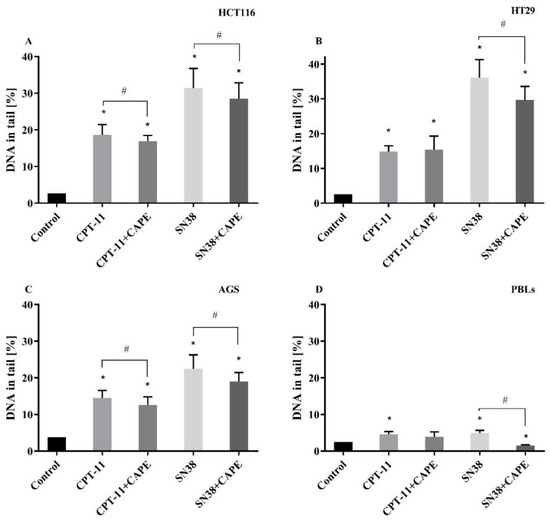 DNA damage measured in HCT116 (A), HT29 (B), AGS (C) and PBLs (D) as the percentage of DNA in the comet tail in the alkaline version of comet assay incubated 24 h with CAPE in the presence of CPT-11 or SN38 (mean ± S.E.M). * p < 0.05 as compared with control (untreated) cells; # p < 0.05 as compared with cells treated drug.