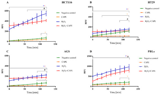 ROS generation in HCT116 (A), HT29 (B), AGS (C) cells and PBLs (D). The series with the preincubation with H2O2. The concentration of CAPE used in experiment was the IC50 value determined for each cancer cell line and for PBLs were used the highest concentration from all designated. * p < 0.05 as compared with control (untreated) cells; # p < 0.05 as compared cells treated H2O2 with cells treated H2O2 + CAPE.