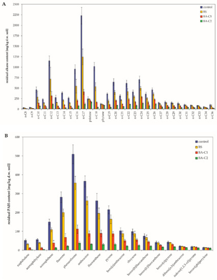 Residual content of (A) alkanes and (B) polycyclic aromatic hydrocarbons (PAHs) in the analyzed microcosms. Control: untreated microcosms, BS: biostimulated microcosms, BA-C1 and BA-C2: microcosms bioaugmented with the bacterial community C1 and the mixed culture C2, respectively. Data are the mean values ± SD (n = 4).