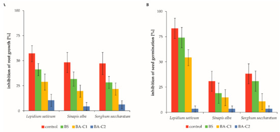 Inhibition of (A) root growth and (B) seed germination in the analyzed soil microcosms. The data are presented as the mean values ± SD (n = 4). Control: untreated microcosms, BS: biostimulated microcosms, BA-C1 and BA-C2: microcosms bioaugmented with the bacterial community C1 and the mixed culture C2, respectively.