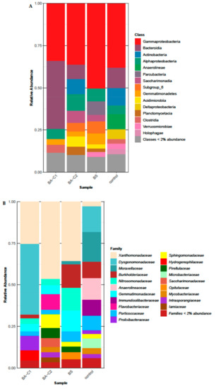 The community structure changed between the treatments (BS, BA-C1, BA-C2) and the control after 60-day bioremediation at the analyzed taxonomic levels (Figure 3). We have skipped analyzing the abundance of phyla and classes because significant differences were seen chiefly in the lower taxa. However, three of the most dominant classes in the control samples—Anaerolineae (9.1%), Deltaproteobacteria (5.8%), and Holophagae (3.2%)—were almost absent in all three treated soils (Figure 3A). This observation is in a good accordance with the substantial decrease of petroleum hydrocarbons in the biostimulated and bioaugmented samples, which, in turn, likely changed the soil environment from mostly anoxic to aerated.