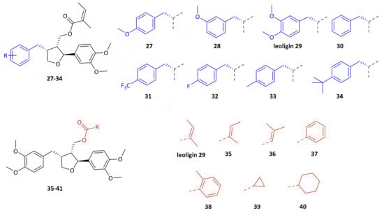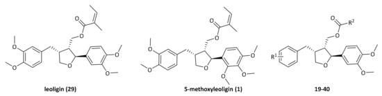 Structures of leoligin 18, 5-methoxyleoligin 1 and general structure of derivatives 19–40.