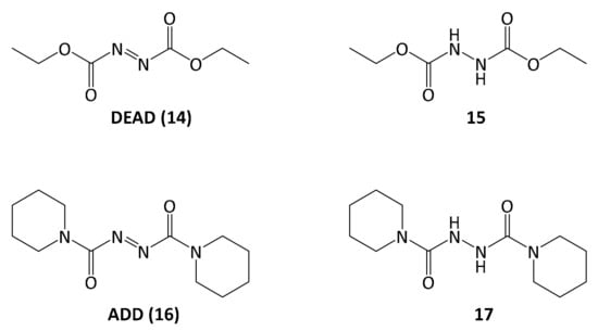 From left to right structures of diethyl azodicarboxylate (DEAD) and its reaction product 15 as well as 1,1′-(azodicarbonyl)dipiperidine 16 (ADD) and its reaction product 17.