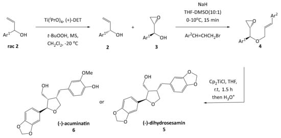Furan type lignans such as (−)-dihydrosesamin 5 and (−)-acuminatin 6 have been synthesized by the group of Roy [], involving a kinetic resolution by a Sharpless asymmetric epoxidation, a Williamson ether synthesis and a radical cyclization reaction according to a protocol developed by RajanBabu and Nugent (Scheme 1) []. This methodology was previously used as entry point for developing the synthesis of leoligin in our group [].