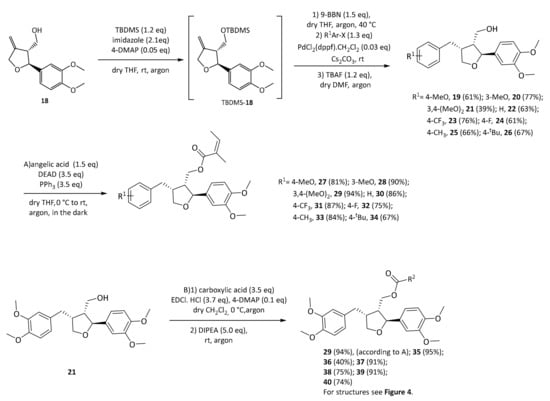 Next, modifications of the aryl group in position 4 were investigated. Compounds 27–34 were prepared according to our previously published protocol for the synthesis of leoligin 29 (see supporting information for details []).