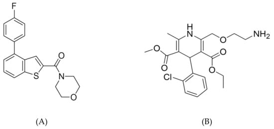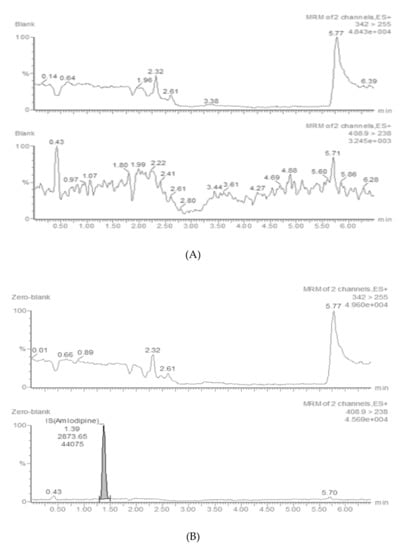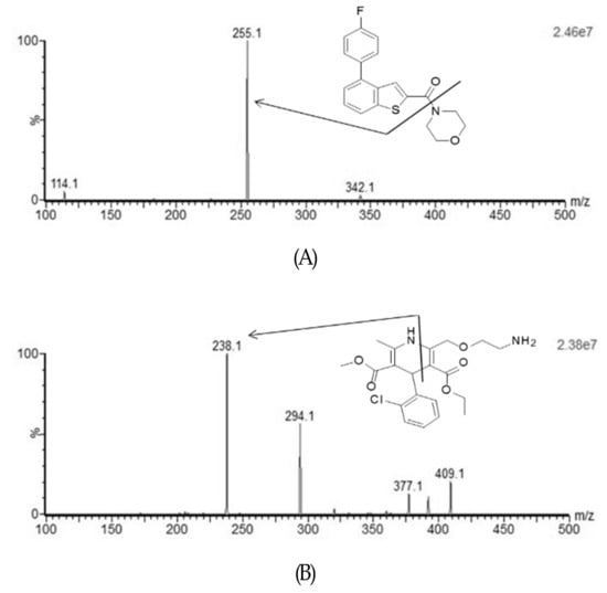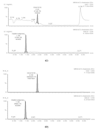 Chemical structures of CK41016 (purity >99.5%) and amlodipine (purity >99.9%) as IS are shown in Figure 10. CK41016 was provided by the Kukje Pharmaceutical Co. (Gyeonggi-do, Korea), and the IS was purchased from Sigma-Aldrich (St. Louis, MO, USA). Methanol, acetonitrile, tetrahydrofuran, and methylene chloride were purchased from J.T. Baker (Phillipsburg, NJ, USA). Formic acid was purchased from Sigma-Aldrich (St. Louis, MO, USA). Distilled water (18.2 MΩ) was obtained with an Elga Purelab Option-Q System (Elga Labwater, Marlow, UK). It was used throughout this study. All other chemicals were of HPLC or analytical grade.