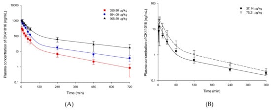 As seen from Table 2, the mean elimination half-life (t1/2) was approximately 206.83 min after IV administration. The AUC0–∞, area under plasma concentration-time curve from time 0 to infinity, significantly increased in a dose disproportional manner from 12.58 μg·min/mL for 350.80 μg/kg to 76.25 μg·min/mL for 905.50 μg/kg. There was a significant (p < 0.05) difference in clearance (CL), which decreased nonlinearly from 27.88 to 11.88 mL/min/kg with the increasing dose. This result might be due to saturation of elimination by the enzyme-dependent clearance mechanism for the drug. After eye drop administration, the Tmax was 4.30–4.40 min, suggesting that CK41016 was quickly absorbed into the body after administration of the eye drop.