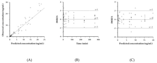 Diagnostic plots for the final PK model of CK41016 after eye drop administration in rabbits, including the observed versus model-predicted concentration (A), individual weighted residual (IWRES) versus time (B) or model-predicted concentration (C) plots, are shown in Figure 7.