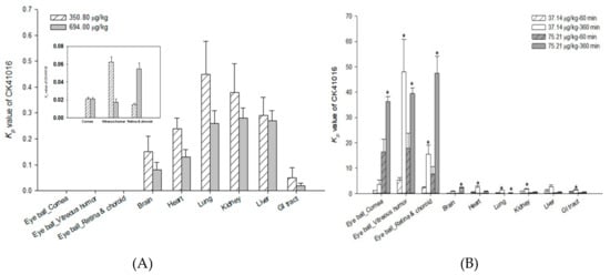 Mean tissue-to-plasma partition coefficient (Kp) values of CK41016 in rat tissues after IV (at 720 min) (A) or eye drop (60 and 360 min) administration (B) (mean ± SE, n = 5, * p < 0.05 between 60 and 360 min).