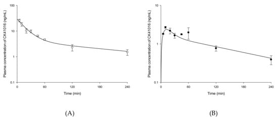 The validated method was applied to a PK study of CK41016 in rats after IV or eye drop administration. The plasma concentration–time curves of CK41016 after IV or eye drop administration are shown in Figure 3. The concentration–time profiles of CK41016 were adequately described by the two-compartment model without lag time using the WinNonlin® software (version 8.1, CertaraTM, Princeton, NJ, USA) program. The estimated results of PK parameters for CK41016 of each group are summarized in Table 2.