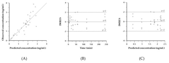 Diagnostic plots for the final PK model of CK41016 after eye drop administration in rats, including the observed versus model-predicted concentration (A), individual weighted residual (IWRES) versus time (B), or model-predicted concentration (C) plots, are shown in Figure 4.