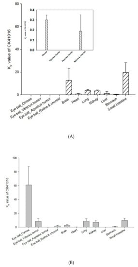 Mean Kp value of CK41016 in rabbit tissues at 240 min after IV (A) or eye drop administration (B) (mean ± SE, n = 5).