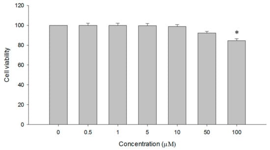 Cytotoxicity of CK41016 in Caco-2 cells (n = 6, mean ± SD, * p < 0.05 between control).