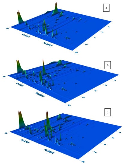 Chromatograms of two-dimensional gas chromatography high-resolution time-of-flight mass spectrometry (GC×GC-HRTOF/MS) of Tokaj wine samples—(a) varietal wine Furmint 2015; (b) Tokajské samorodné dry 2008; (c) 6-putňový Tokaj selection 2003.