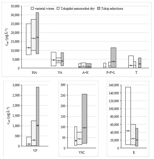 Total concentration of individual groups of volatile organic compounds identified in samples of Tokaj wines. Legend: HA—higher alcohols; VA—volatile acids (except acetic acid); A + K—aldehydes and ketones; F + P + L—furanoids, pyranoids, and lactones; T—terpenoids; VP—volatile phenols; VSC—volatile sulphur compounds; E—esters.