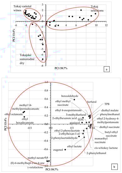 Plot (a) and loading plot (b) of the first and second principal components (PCs) after PCA of VOC profiles of Tokaj varietal wines, wine classified as Tokajské samorodné dry, and Tokaj selections.