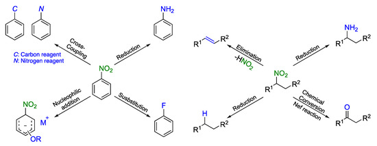 However, the nitro group, which is often described as a “synthetic chameleon [23],” serves as a precursor for versatile functionalities, such as formyl, acyl, cyano, and amino groups (Scheme 1) [24,25,26,27,28]. Moreover, the nitro group has been proved to activate many different scaffolds because of its strong electron-withdrawing ability, facilitating the reaction with nucleophilic reagents [29,30]. The nitro group is also a good leaving group, which is often involved in addition–elimination reactions [31,32].