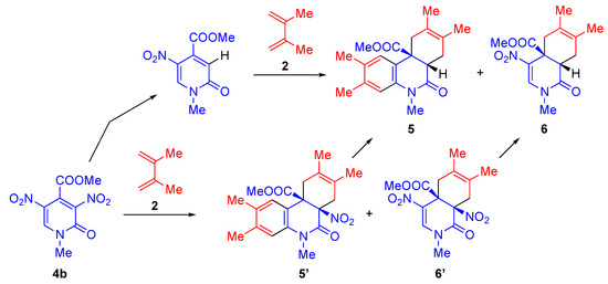 It is known that 5-nitropyridones 4 possessing electron-withdrawing groups at the 3- and/or 4-positions have two electron-deficient sites on the ring. When these substrates are subjected to D–A reactions with diene 2, the reaction proceeds stereoselectively to produce the functionalized cis-adducts 5 and 6, accompanied by denitration (Table 2). Since the reaction is conducted under harsh conditions, the denitration of either pyridone 4b or the cycloadducts 5′ and 6′ might occur (Scheme 2), however a detailed explanation has not been reported in the literature [34].