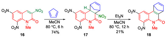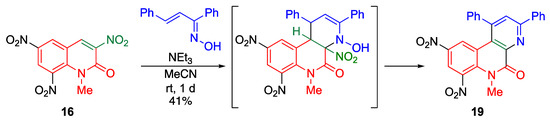 On the contrary, 1-methyl-3,6,8-trinitro-2-quinolone 16 undergoes cycloaddition with dienes easily under mild conditions (Scheme 3). Indeed, the cycloaddition of 16 with cyclopentadiene proceeds smoothly to furnish a tetracyclic compound 17 that aromatizes via elimination of a nitrous acid in the presence of triethylamine to afford compound 18 [37]. Similarly, the cycloaddition using α,β-unsaturated oxime, instead of cyclopentadiene, as a heterodiene affords the polycyclic diazaphenanthrene 19 (Scheme 4) [38].