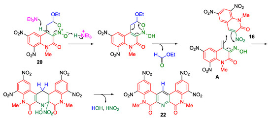 Interestingly, a quinolino[3, 4-b][1,9]diazaphenanthrene derivative 22 is formed when the same reaction is conducted in the presence of triethylamine (Scheme 5) [38]. A plausible mechanism is shown in Scheme 6. After forming the cyclic nitronate 20, triethylamine assists the proton transfer from the 4-position to the anionic oxygen of the nitronate. The subsequent retro D–A reaction gives the α,β-unsaturated oxime A, accompanied by a loss of ethyl formate. Oxime A serves as an electron-rich heterodiene that undergoes cycloaddition with another molecule of 16 to afford a new pyridine ring, and subsequent aromatization and elimination of nitrous acid and water furnishes the polycyclic product 22. In this reaction, two molecules of trinitroquinolone 16 undergo two kinds of cycloaddition reactions: one molecule serves as a heterodiene and the other serves as a dienophile. This is the first example of a nitroalkene that exhibits dual behavior in the same reaction mixture (Figure 5).