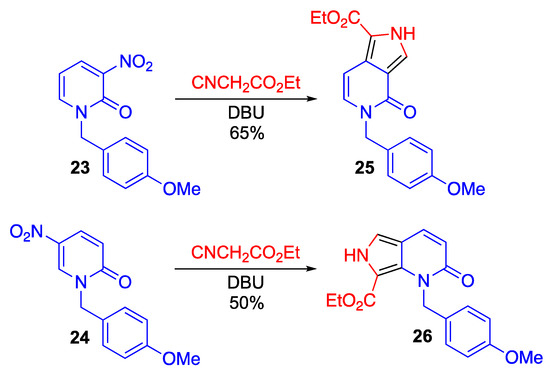 The strongly electron-withdrawing ability of the nitro group activates the scaffold for nucleophilic attack at the vicinal position on the nitroalkene. The nitroalkene moiety of nitropyridones is also susceptible to nucleophilic reaction. Indeed, 1-substituted nitropyridones 23 and 24 react with ethyl isocyanoacetate in the presence of 1,8-diazabicyclo[5.4.0]undec-7-ene (DBU) to afford the pyrrolopyridine derivatives 25 and 26, respectively (Scheme 7) [40]. In the latter case, nucleophilic attack of isocyanoacetate occurs regioselectively at the 6-position.