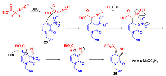 The reaction is initiated by the nucleophilic addition of isocyanoacetate to nitropyridone under basic conditions to produce an anionic intermediate stabilized by the nitro group (Scheme 8). Then, the nucleophilic attack of the nitronate to the protonated isocyano group affords dihydro-2H-pyrrole, from which a pyrrole ring is produced via aromatization by elimination of nitrous acid.