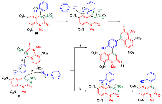 From another viewpoint, trinitroquinolone is an aromatic compound. Hence, this reaction can be regarded as an electrophilic arylation, which is not achieved in the usual Friedel–Crafts reaction. This transformation is initiated by the nucleophilic addition of phenoxide at the 4-position of 16 (Scheme 10). The newly introduced benzene ring is aromatized with the assistance of another phenoxide. In addition, proton transfer from the 4-position to an adjacent position of the quinolone ring occurs to afford the dianionic intermediate B. Since B is a highly electron-rich species, it immediately attacks another molecule of 16 to afford bis(quinolyl)phenols 31 (path a). On the other hand, protonation of B followed by elimination of nitrous acid is the preferred route to furnish monoquinolylphenol when electron-deficient or bulky phenoxides are used (path b).