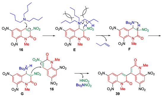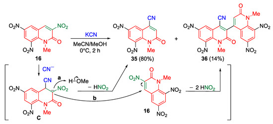 Nitriles represent an important structural motif in medicinal chemistry because of their versatile biological activities [46]. In addition, they have been recognized as extremely useful intermediates for the preparation of other useful building blocks [47,48,49]. Therefore, considerable research effort has been dedicated to the development of methods for introducing cyano groups into organic molecules. Inspired by the above methods for direct C–C bond formation on the MeQone framework, researchers have used potassium cyanide as a carbon nucleophile for reacting with trinitroquinolone 16 to prepare 4-cyano-2-quinolone derivative 35 (Scheme 11) [42]. In this reaction, dimeric product 36 is also obtained. After the addition of a cyanide to 16, the anionic intermediate C is formed, which is a common intermediate for both products 35 and 36. When C is protonated, followed by the elimination of nitrous acid, 35 is obtained (path a). The dimeric product 36 is a result of the addition of C to another molecule of 16 (path b).