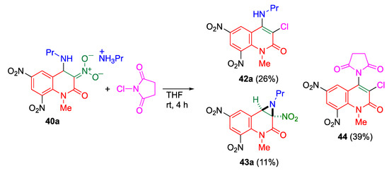 The reaction of trinitroquinolone 16 with excess propylamine in acetonitrile affords the Meisenheimer complex 40a, which can be used for further functionalization of the MeQone framework upon treatment with electrophiles. When the ammonium salt 40a is treated with N-chlorosuccinimide (NCS), three kinds of functionalized quinolone are obtained; the amino-chlorinated product 42, the aziridine-fused quinolone 43, and the imido-chlorinated product 44 (Scheme 15) [52].