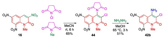 The amino-halogenation of trinitroquinolone 16 can be conducted in a one-pot two-step manner, in which the selectivity of 42 is increased by using an excess amount of amine (Table 14). The aliphatic and aromatic primary amines undergo the reaction to afford the corresponding amino-chlorinated products 42a–k in moderate yields. However, less nucleophilic p-nitroaniline shows no change. While the acyclic secondary amine, diethylamine, does not furnish 42m, the cyclic secondary amine, morpholine, yields the corresponding amino-chlorinated product 42n. Ammonia is difficult to handle in this protocol. Instead, the imido group is considered a masked form of an amino group. Indeed, the imido-chlorinated product 44 can be transformed to the amino-chlorinated quinolone 42b by hydrazinolysis (Scheme 17).