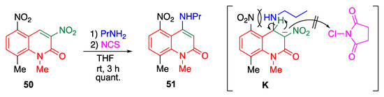 1,8-Dimethyl-3,5-dinitro-2-quinolone 50 exhibits a reactivity different from those of the other nitroquinolones 47. When 50 is subjected to the reaction under the same conditions, cine-substitution takes place, rather than amino-chlorination and aziridination, affording compound 51 quantitatively (Scheme 18). In this reaction, the addition of a propylamine affords the Meisenheimer complex K. However, the steric repulsion with the peri-substituent increases the steric hindrance around the 3-position, thus preventing the attack to NCS. Instead, proton transfer from the 4-position followed by elimination of the nitrite ion affords the cine-substituted product 51.