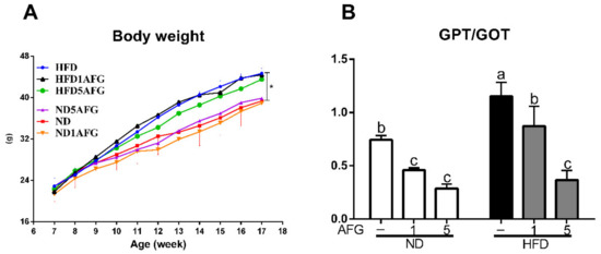 Body weight and index of liver injury. (A) The changes in body weight of mice fed with different diets from 7 to 18 weeks. Results are expressed as the mean ± SD for each group of mice (n = 4). The asterisk indicates a significant difference in weight at 18 weeks (p < 0.05). HFD: high-fat diet, HFD1AFG: HFD plus 1% AFG, HFD5AFG: HFD plus 5% AFG, ND: normal diet, ND1AFG: ND plus 1% AFG, ND5AFG: ND plus 5% AFG. (B) The ratio of serum GPT/GOT. The data represent the mean ± SD of four mice. The different letter indicates a significant difference at p < 0.05.