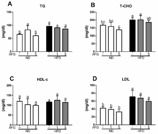 To clarify the effect of AFG on lipid metabolism, we measured the serum levels of lipid and glucose metabolism markers at the final day of the experiment after 12 h fasting. As shown in Figure 2A–D, the serum levels of triacylglycerol (TG), total cholesterol (T-Cho), and low-density lipoproteins (LDL) increased significantly in HFD group (p < 0.05), and decreased slightly by AFG although there was no significant difference.
