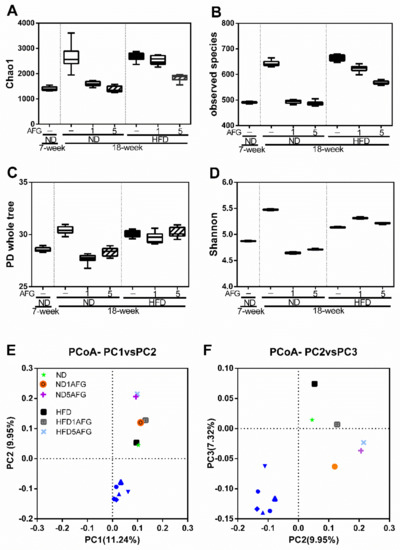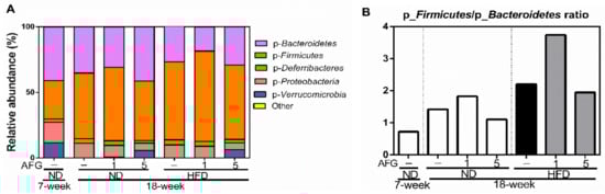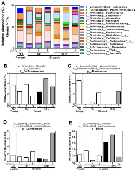 To know the modulation of AFG on gut microbiome, first we investigated the changes of individual microbial species at the phylum level. The phylum of Verrucomicrobia decreased by aging and HFD diet, and recovered by 5% concentration of AFG supplementation (Figure 4A). Moreover, the ratio of p-Firmicutes to p-Bacteroidetes in the ND group increased with aging from 7 weeks to 18 weeks, and decreased by 5% AFG supplementation. This ratio was also increased by HFD, and reduced by 5% AFG supplementation (Figure 4B).
