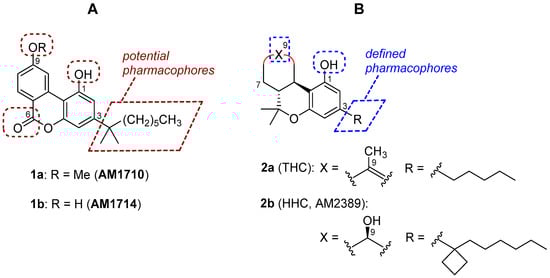 (A), structures of AM1710 and AM1714 and potential pharmacophores of the cannabilactone template. (B), representative tetrahydrocannabinol (THC) and hexahydrocannabinol (HHC) analogs with the well-defined pharmacophoric regions.
