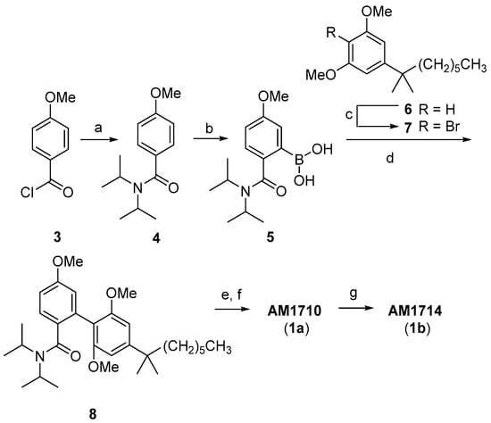 Earlier synthesis of AM1710 and AM1714 (6–7 steps, 27–38% overall yields) a. a Reagents and conditions: (a) Diisopropylamine, Et3N, CH2Cl2, rt, 2 h, 75% [26]; (b) i. sec-BuLi, N,N,N′,N′-tetramethylethylenediamine (TMEDA), THF, −78 °C, 1 h; ii. B(OCH3)3, −78 °C to rt, 12 h; iii. 5% aq. HCl, 96%; (c) Br2, CCl4, 0 °C, 20 min, 85%; (d) Pd(Ph3P)4, Ba(OH)2, DME/H2O, 110 °C, microwave irradiation, 15 min, 83%; (e) 9-iodo-9-BBN, CH2Cl2, 0 °C, 4 h; (f) AcOH, reflux, 5 h, 76% from 8; (g) BBr3, CH2Cl2, reflux, 12 h, 72%.