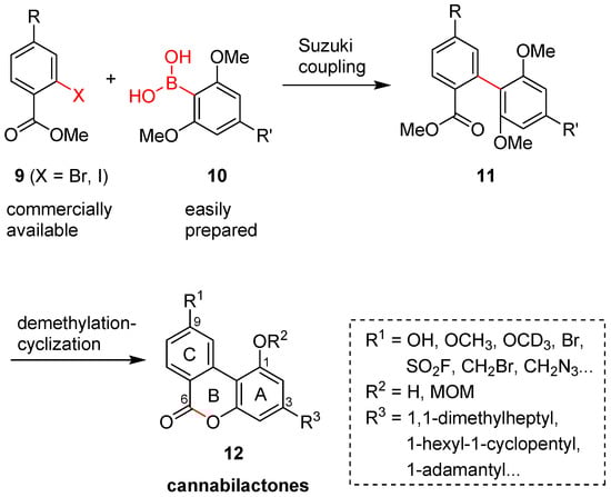 A new approach to synthesize cannabilactones using Suzuki cross-coupling reaction followed by one-step demethylation-cyclization is presented. The two key cannabilactone prototypes AM1710 and AM1714 were obtained selectively in high overall yields and in a lesser number of synthetic steps when compared to our earlier synthesis. The new approach expedited the synthesis of cannabilactone analogs with structural modifications at the four potential pharmacophoric regions.