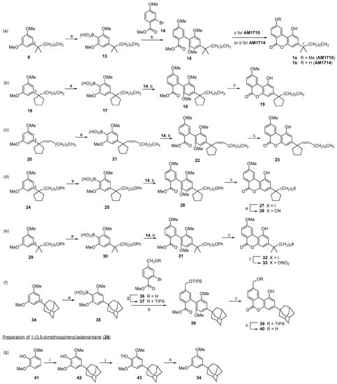 Synthesis of AM1710, AM1714, and C3 side chain modified cannabilactones (a–g) a. a Reagents and conditions: (a) i. n-BuLi, THF, −78 °C, 45 min, 10 °C, 1.5 h, −78 °C 30 min; ii. B(OMe)3, −78 °C to rt, overnight; iii. 5% aq. HCl, 88% for 13, 65% for 17, 80% for 21, 73% for 25, 61% for 30, and 61% for 35; (b) Cs2CO3, DME/H2O, Pd(Ph3P)4, 110 °C, microwave irradiation, 45 min, 84% for 15, 69% for 18, 81% for 22, 76% for 26, 84% for 31, and 83% for 38; (c) 9-iodo-9-BBN, CH2Cl2, 0 °C to rt, overnight, 78% for AM1710, 75% for 19, 70% for 23, 67% for 27, 68% for 32, and 73% for 39; (d) BBr3, CH2Cl2, 2 days, reflux, 74% for AM1714; (e) NaCN, DMSO, rt, overnight, 90%; (f) AgNO3, CH3CN, rt, 5 h, 91%; (g) TIPSOTf, 2,6-lutidine, DCM, 0 °C to rt, 2 h, 89% (h) TBAF, THF, rt, 2 h, 90%; (i) 1-adamantanol, MeSO3H, 50 °C, 3 h, 58%; (j) Tf2NPh, Et3N, 4-(dimethylamino)pyridine (DMAP), CH2Cl2, reflux, 18 h, 95%; (k) PdCl2(Ph3P)2, dppp, n-Bu3N, HCOOH, polymethylhydrosiloxan (PMHS), DMF, reflux, 19 h, 92%.