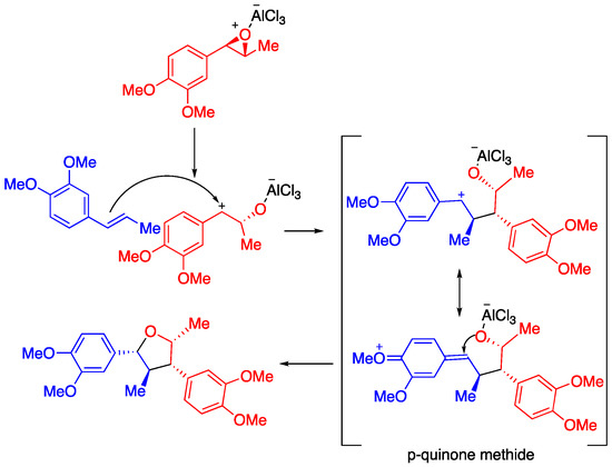 In order to explain the reaction between an alkene and an epoxide a two-step mechanism is proposed. Initial attack of β-carbon of alkene to α-carbon of activated epoxide would afford a benzylic carbocation, stabilized by para-quinone methide structures, which upon ring closure would give the tetrahydrofuran (Scheme 4). Stereocontrol would result from the first step through a less strained transition state resulting from the combination of both planar reactants and subsequent cyclization through attack of the oxygen atom on the less hindered face of the carbocation (Scheme 4).