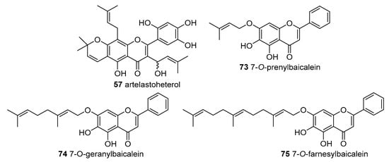 Flavone derivatives. The naturally-occurring derivatives were obtained mainly from Moraceae family, belonging to Artocarpus [18,19,21,30,31,32,33,34,35,36], Dorstenia [20,37] and Cudrania [38,39] species (compounds 47–76, Table 3 and Figure 4, Figure 5 and Figure 6). A few examples from Fabaceae [22,40] and Euphorbieaceae [41,42] families were also isolated. Only three analogues were synthesized and were O-prenylated ones (7-O-prenyl- 73, 7-O-geranyl- 74 and 7-O-farnesylbaicalein 75) (Table 3 and Figure 6) [43].