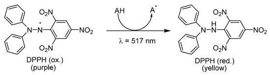 DPPH● (1,1-diphenyl-2-picrylhydrazyl) is a stable free radical characterized by an absorption band at about 517 nm. In the presence of an antioxidant molecule (AH), DPPH● trap a hydrogen atom to its reduced hydrazine form with consequent loss of the typical purple colour to a pale yellow one (Scheme 1).
