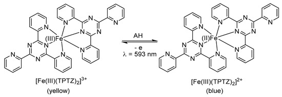 This method is based on the reduction of the colourless complex of ferric iron and 2,3,5-triphenyl-1,3,4-triaza-2-azoniacyclopenta-1,4-diene chloride (TPTZ) to the blue-coloured ferrous form at low pH (Scheme 3). FRAP reagent is produced by mixing acetate buffer (pH 3.6), TPTZ solution and FeCl3 6H2O. FRAP values are obtained by comparing the absorbance change at 593 nm in reaction mixtures with those containing ferrous ions in known concentration [17,53]. The redox potential of Fe(III) salt (−0.70 V) is comparable to that of ABTS●+ (0.68 V), therefore, the main difference between TEAC assay and the FRAP assay is that the first is carried out at neutral pH and latest under acidic (pH 3.6) conditions. Usually a calibration curve using antioxidant trolox is made and the results are expressed as trolox equivalents per kg (solid food) or per L (beverages) of sample [56].