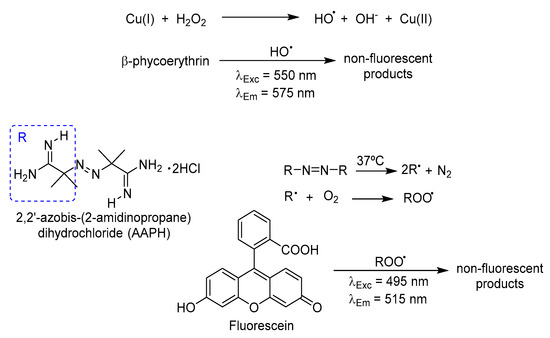 2,2′-Azobis-(2-amidinopropane)dihydrochloride (AAPH) is the most used peroxyl radical generator in hydrophilic systems [24] and as fluorescent probe can be used β-phycoerythrin or more recently fluorescein [16,25,28]. Thus, peroxyl radical are formed by thermodecomposition of AAPH, giving an alkyl radical that react with molecular oxygen to give peroxyl radical. The decay in fluorescence is recorded and the results of the scavenging activity is expressed as Trolox equivalents [56].