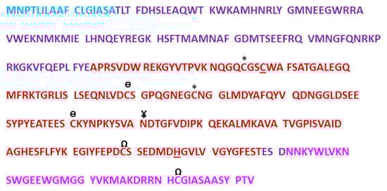 The primary sequence of the full length human inactive human cathepsin L: Blue = 17 Amino acid signal (prepro) peptide, Purple = Propeptides/activation peptides: 96 amino acid (Thr18–Glu113) and 3 amino acid (Glu289–Asp291), Red = Heavy chain peptide, Pink = Light chain peptide; * Disulfide bond pair residues, Cys135–Cys178, Ɵ Disulfide bond pair Cys169–Cys211, Ω Disulfide bond pair Cys268–Cys322, ¥ The site of N-linked glycosylation. The two key catalytic residues of the active site, Cys25 and His163 (numbering of mature cathepsin L) residing in the heavy chain are underlined.