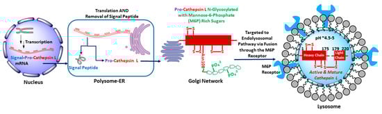 Human cathepsin L gene, CTHL (Uniprot primary accession number: P07711), located at the 9q21-q22 position of chromosome 9, encodes for a total of 333 amino acid peptide sequence (M.W. = 37,564 kDa) [31]. The coding space includes the regions of a N-terminal signal peptide, two pro-peptides, and two mature peptides comprising of a heavy (H) chain and a light (L) chain (Figure 1). After transcription, the signal peptide is co-translationally removed in polysome and the resulting 41 kDa pro-cathepsin L is translocated to endoplasmic reticulum where it undergoes N-linked glycosylation with mannose rich sugars. The mannose sugars on the pro-cathepsin L are then phosphorylated in cis Golgi by UDP-N-acetylglucosamine:N-acetylglucosaminephosphotransferase enzyme [32]. The mannose-6-phosphate (M6P) receptors located on the surface of the trans Golgi network recognize the M6P-pro-cathepsin peptide and deliver the pro-cathepsin L peptide to the lysosome via the endolysosomal pathway. The weakly acidic environment of endosome/lysosome releases M6P receptors and the phosphate group from mannose sugars is removed by a lysosomal acid phosphatase [33,34]. Activation to mature cathepsin L form then occurs by removal of propeptides either by autocatalysis [35] or by aspartyl cathepsin D in the acidic environment of lysosome [36]. This leads to the double chain form of mature and active cathepsin L, comprising of H and L domains, connected by disulfide bridges, (Figure 2). It is to be noted here that several isoforms of cathepsin L have also been observed in specific cell types due to alternative splicing of mRNA transcripts and alternative translation [4,37,38,39,40,41].