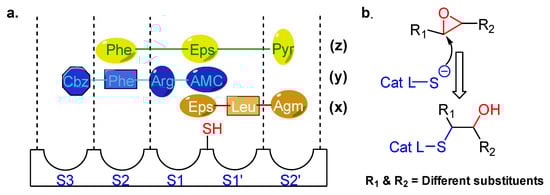 (a) Proposed binding mode of (x) E-64, (y) a putative cathepsin L substrate, and (z) CLIK148 to the active site of cathepsin L. (b) Inactivation mechanism of cathepsin L by epoxy-containing inhibitors.