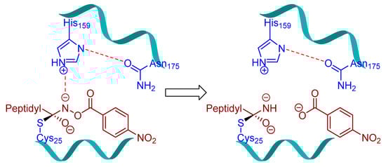 Peptidylhydroxylamines were first introduced as mechanism-based inhibitors of serine and cysteine proteinases [104,105,106,107]. Bromme et al. adapted this scaffold and prepared a library of N-peptidyl-O-acyl hydroxylamines which exhibited rapid and selective inactivation of several lysosomal cysteine proteinases [108]. This class of inhibitors occupied the active site of the enzyme and irreversibly inactivated cysteine cathepsins as the free enzyme activity was not recovered when the enzyme-inhibitor complex was exposed to exhaustive ultrafiltration (up to an enzyme/free inhibitor ratio of <1:0.05) or chromatography on Sephadex G-10. Among developed inhibitors, Z-Phe-Phe-NHO-MA (Entry 6, Table 2) inhibited cathepsin L with most potency and showed significant selectivity, 58-fold and 436-fold, over cathepsin S and cathepsin B, respectively. Interestingly the stability and efficacy of this class of inhibitors were determined by the nature of substitutions on hydroxylamine oxygen as their electron-withdrawing tendencies showed a positive correlation with inactivation kinetics. Although this class of inhibitors exhibited desirable traits with respect to both potency and selectivity, they suffered majorly from aqueous stability issue; half-lives (t1/2) only in the range of 45209 min in aqueous solution. In another study, Bromme et al. developed a series of N-peptidyl-O-acyl hydroxamates with lysine in P1 position with improved inhibitory profile for cysteine proteases over their serine counterparts [109]. The maximum inhibition was observed by Z-Phe-Lys-NHO-NBz (Entry 8, Table 2), with 7-fold selectivity over cathepsin S, and >100-fold selectivity over cathepsin B. The authors postulated that the active site Cys residue attacks the carbonyl of the hydroxamate and forms a tetrahedral intermediate, whereas the nitrogen of the hydroxamate, which primarily remains deprotonated (pKa < 5), presumably engages in an electrostatic interaction with the active site His159 residue (Figure 5).