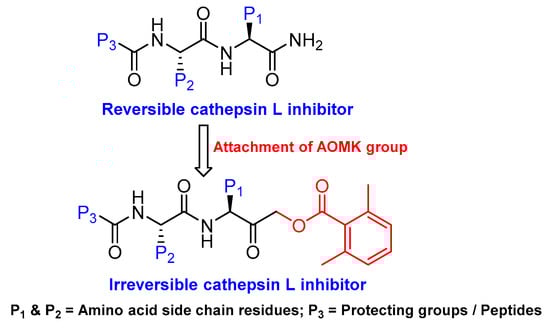 Another class of peptidyl inhibitors that spans the active site and utilizes the catalytic machinery of cathepsin L for effective attenuation of enzyme activity is peptidyl acyloxymethanes. Krantz et al. developed a library of inhibitory compounds with a general sequence, Z-Phe-X-CH2OCO-R; here they systematically varied the amino acid residue at P1 (denoted as X) and P1′ (denoted as R) positions [112]. Among the synthesized compounds, Z-Phe-Cys(SBn)-CH2OCO-2,6-(CF3)2-Ph (Entry 9, Table 2) exhibited almost a diffusion-controlled inactivation kinetics toward cathepsin L, however it showed only marginal selectivity over cathepsin B and cathepsin S. By analyzing the structure-activity relationships of the library, the author elucidated the importance of S1′ site in cathepsin L that could potentially be used to harness selectivity among other cysteine cathepsins. In a separate study, Torkar et al. designed a library of peptides for cathepsin L that spanned the active site and attenuated the enzyme activity via a non-covalent interaction [113]. They initially evaluated the compounds’ activities against cathepsin L and cathepsin B, and compared their hits against cathepsin K and S. The authors discovered five most selective non-covalent, peptidyl inhibitors of cathepsin L, and transformed them into irreversible inhibitors by strategically appending electrophilic warhead (Figure 6)—acyloxymethyl ketone (AOMK) groups (Entry 10, Table 2). However, the attachment of the AOMK group drastically impacted the selectivity profiles of these inhibitors, suggesting the importance of the adjuvant effect of prime site targeting in determining the efficacy and selectivity of this class of compounds. This class of inhibitors found wide-spread utilities in detecting protease activity and were utilized to develop activity-based probe; this will be discussed in the later sections.