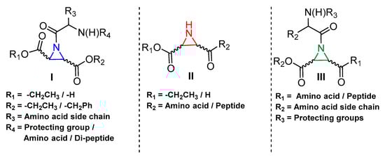 - Schirmeister, T. New Peptidic Cysteine Protease Inhibitors Derived from the Electrophilic α-Amino Acid Aziridine-2,3-dicarboxylic Acid. J. Med. Chem. 1999, 42, 560–572. [Google Scholar] [CrossRef] [PubMed]